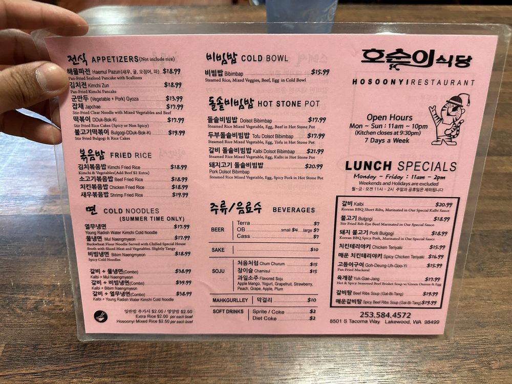 Hosoonyi Korean Restaurant in Edmonds, WA offers a diverse menu with options for everyone, including vegan and vegetarian dishes. The cozy space provides a relaxed atmosphere perfect for group gatherings or family dinners. Customer reviews highlight the delicious soft tofu soups and flavorful entrees like the panfried seafood pancakes and sauteed spicy octopus. The restaurant is known for its generous side dishes and great selection of Korean beverages. While some customers mention slow service, the overall dining experience is highly recommended for those seeking authentic Korean cuisine. Don't miss out on the opportunity to try the signature dishes like the soft tofu soups and spicy stews at Hosoonyi Korean Restaurant. Enjoy a taste of Korea without leaving Washington at this popular dining spot.